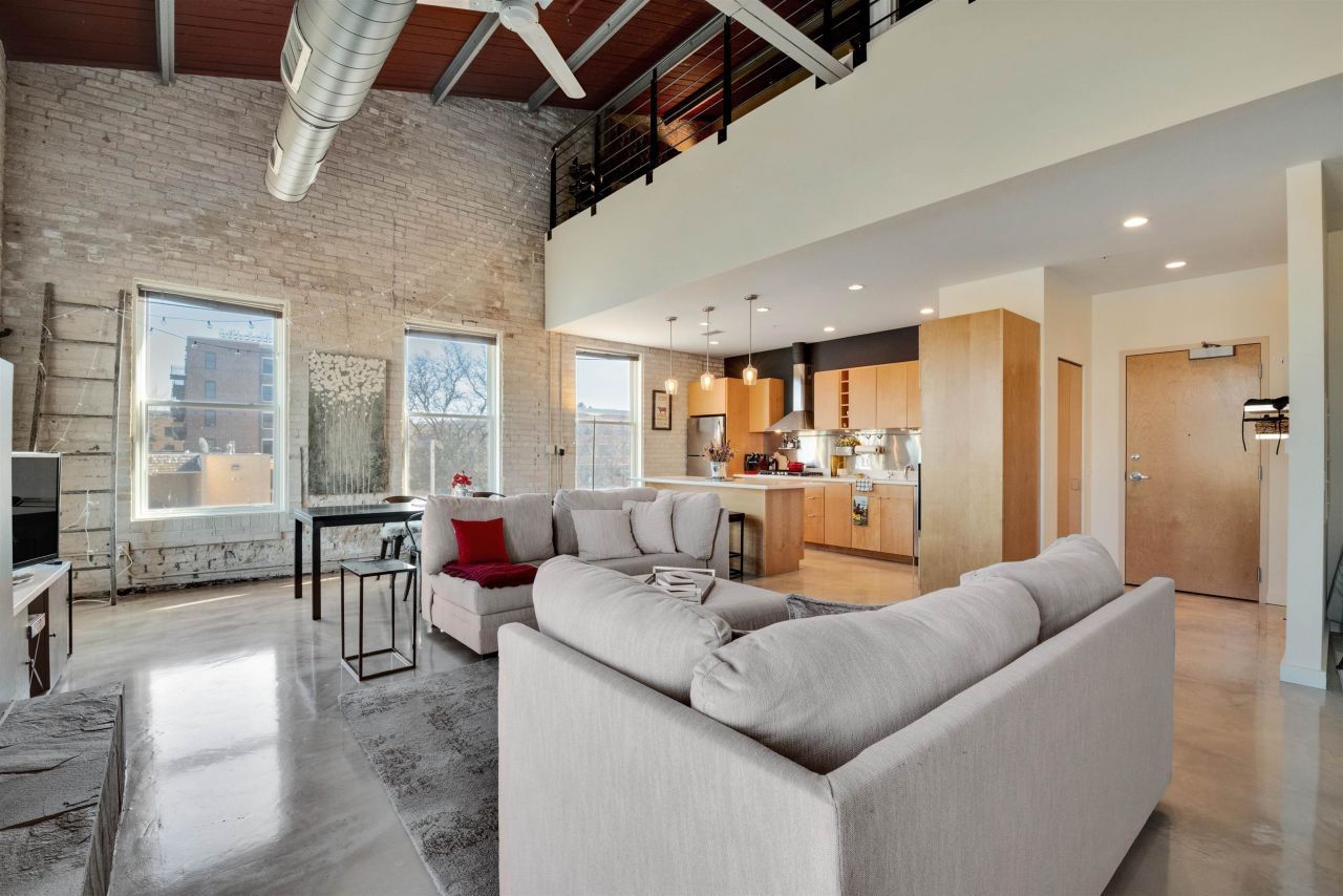 Experience the best of downtown Middleton at Valencia Lofts, a distinctive condo community surrounded by shopping, dining, parks, and summer entertainment all within walking distance. This condo blends urban style with comfort, featuring soaring vaulted ceilings, exposed steel beams, and original brick walls. The open-concept living area is filled with natural light from floor-to-ceiling windows, anchored by a cozy fireplace and direct access to a private balcony. The kitchen is designed for both function and style with stainless steel appliances, modern backsplash, breakfast bar, and generous storage. Upstairs, there is the lofted primary suite, a full bath, walk-in closet, and a flexible bonus room perfect for an office, reading nook, or added storage. Living here means enjoying an energetic, walkable lifestyle with everything you love just outside your door!